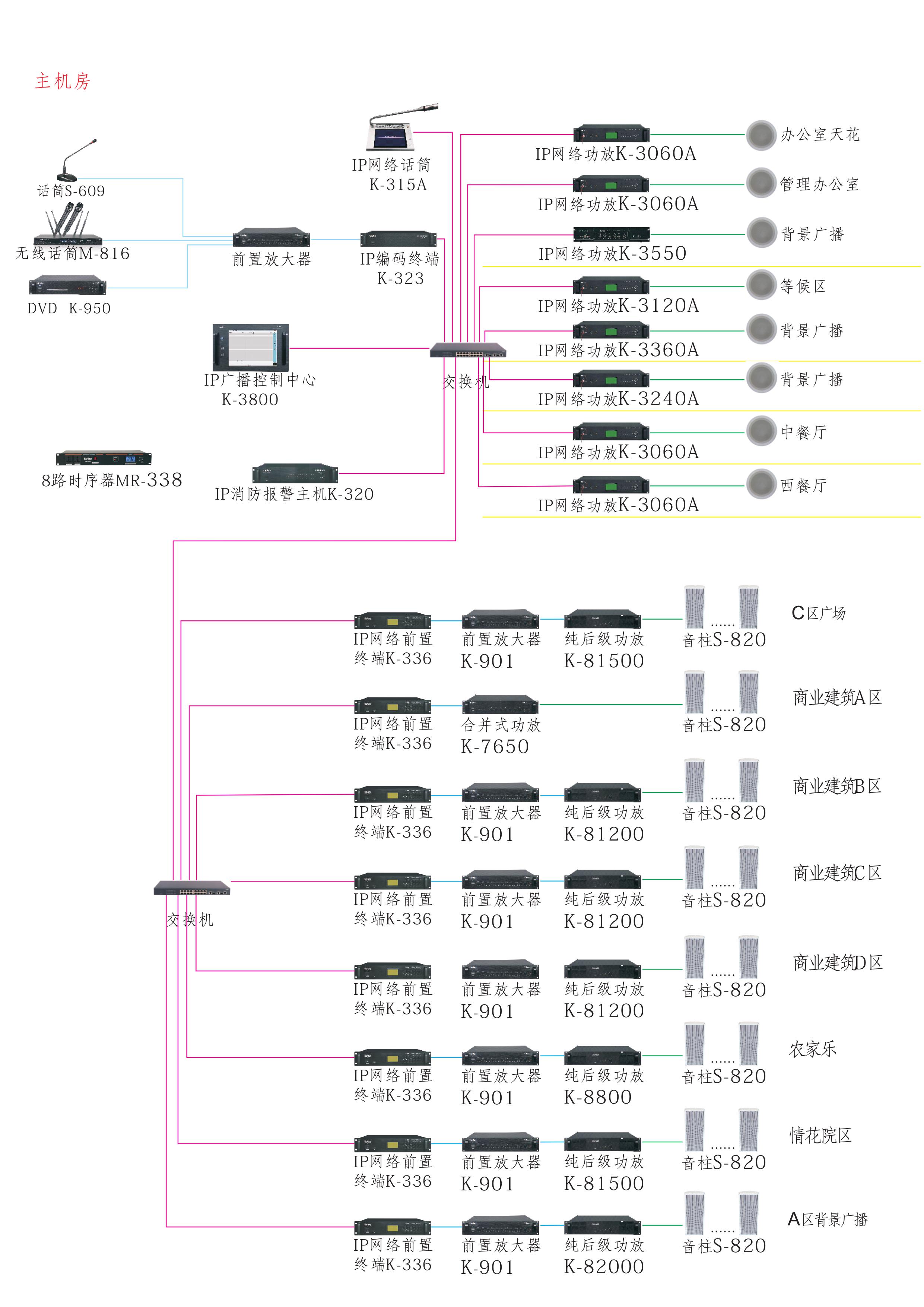 各樓層選用性價比高的8分區(qū)IP網(wǎng)絡(luò)音頻輸出單元,單臺終端和功放可以管理8個樓層音頻信號,同時可選用6備1的主備切換器。